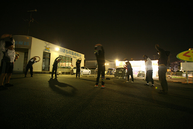外の駐車場にて、山城先生指導の元、ストレッチ体操 約5分。