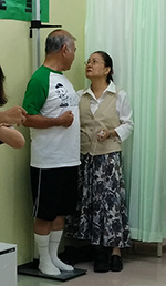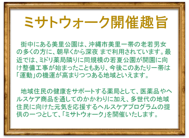 一通り測定が終わったら、みんな集合して、ミドリの保健室の玉城武範さんよりミサトウォークの趣旨とウォーキングガイドの久高友嗣さんから説明がありました。