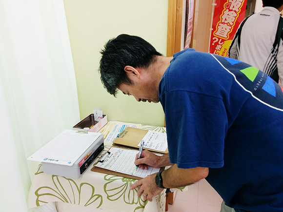 受付用紙に名前、連絡先など簡単な項目を記入します。