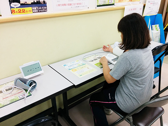 受付を済んだら、バイタルチェックという体調の確認・カラダの測定を行います。 まずは血圧測定。 血圧と脈拍で、自分の今日のコンディションを確認します。