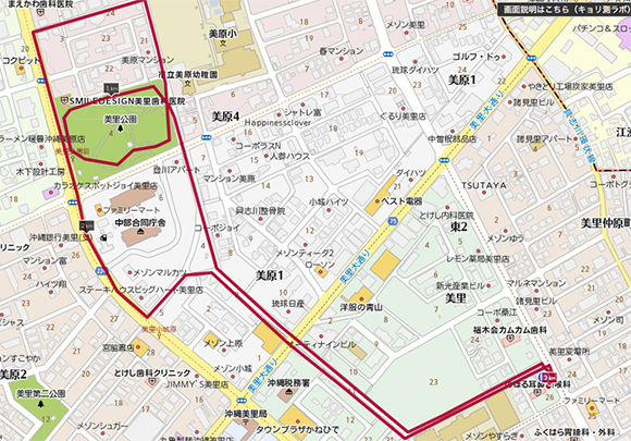 美里公園を1周し、近くを周り、美里公園に戻りさらに1周、くすりのミドリに戻るコースです。