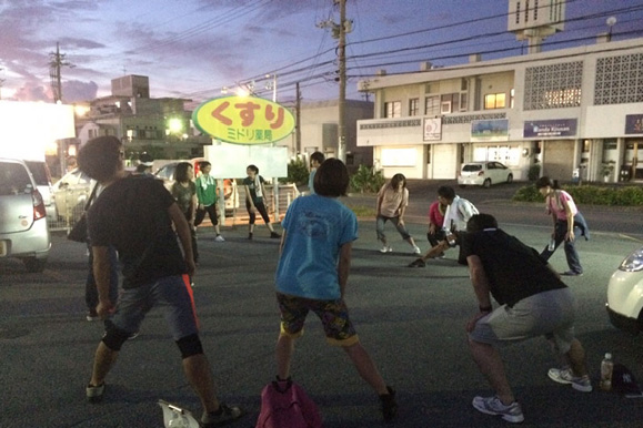 ミドリの保健室から外の駐車場へ移動。この時19時50分、空を見上げれば夕暮れのオレンジと夜空がせまるマジックアワー。駐車場で気持ちよくストレッチ体操スタート。