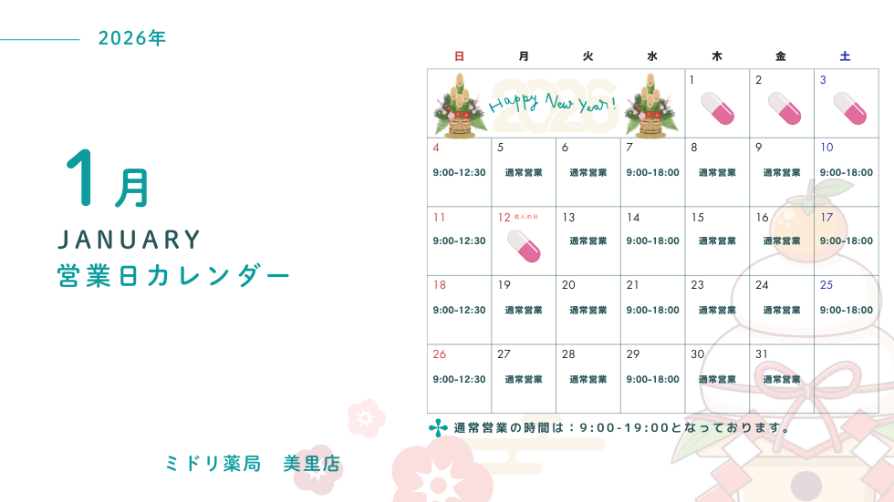 💊休業日:1/1(木)~ 1/3(土)、1/12(月・成人の日)